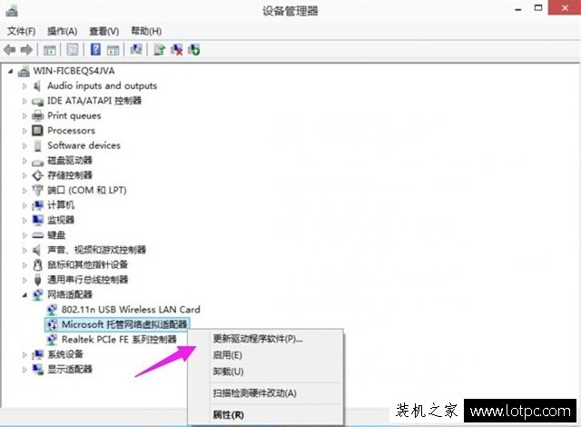 2、我們在設備管理器中,展開網絡適配器,找到“Microsoft 托管網絡虛擬適配器”并鼠標右鍵點擊啟用,如下圖所示: