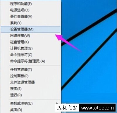 1、我們在桌面左下角處“開始菜單”按鈕上鼠標右鍵點擊,彈出菜單欄之后點選“設備管理器”,如下圖所示: