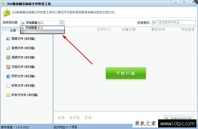 打開360勒索蠕蟲病毒文件恢復(fù)工具,選擇加密文件所在驅(qū)動器: