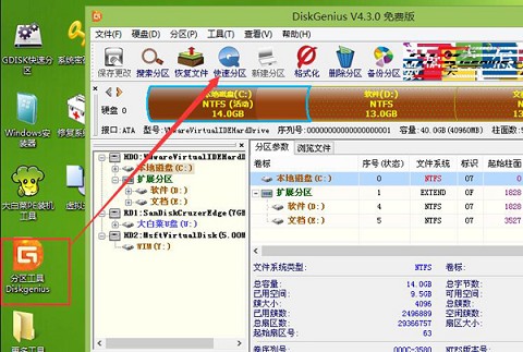 2、進入PE桌面上后打開DiskGenius工具,點擊“快速分區”,如下圖所示:
