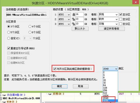 3、接下來勾選“對齊分區到此扇區數的整數倍”,選擇扇區數值(32位系統為2048,64位系統為4096),選擇4096數值就是4K對齊,如下圖所示: