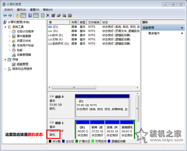 點(diǎn)擊左側(cè)欄存儲(chǔ)--》磁盤管理,這時(shí)就進(jìn)入了磁盤管理的界面了,如下圖所示: