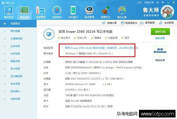 考慮到每個人的win操作系統都不一樣,我們可以通過軟件來檢測查看電腦是什么系統,我們下載“魯大師”軟件,打開“魯大師”,然后在【硬件檢測】選項卡中查看電腦概述瀏覽下[操作系統]那項就可以知道我們是什么系統了。