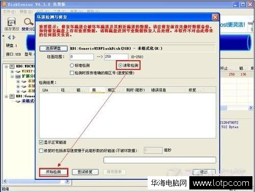 修復方法二:DiskGenius軟件修復,選擇中需要修復的硬盤盤符,然后點擊硬盤選項,選擇“壞到檢測與修復”,選擇之后勾選讀取檢測,然后點擊開始檢測,如果時間比較長也可以選擇標準檢測。開始檢測之后就會對壞道進行掃描,掃描完成后就會出現一個是否有壞道的提示。如果有壞道就直接修復就可以了。