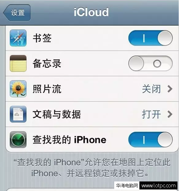iCloud中有許多功能,登錄后查看“設置|iCloud”中“查找我的iPhone”功能是否被激活,如果該功能處于關閉狀態(tài),則需要點按它將其打開。
