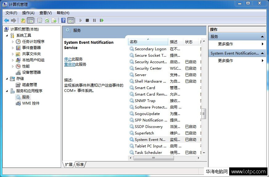 然后在桌面上右擊“計算機”點擊”管理“,然后點擊“服務和應用程序”,點擊“服務“,找到名稱為”System event notification“的服務,點擊重啟動此服務。