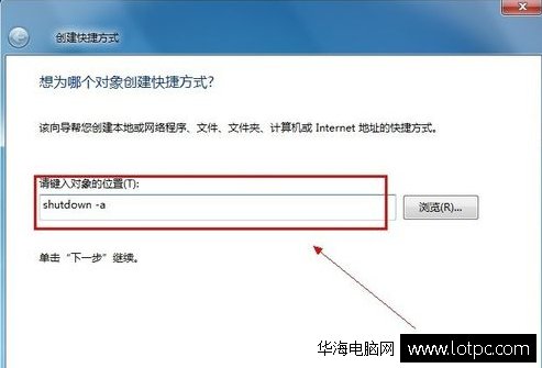 2.點擊【快捷方式】后:輸入【at 18:00 shutdown -s】在對像位置。 注:里面的18:00就是18點關閉電腦。以后也是到這個時間也會自動關機的。