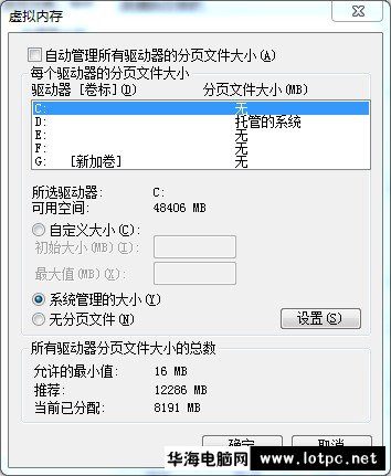華海電腦網:可能是因為系統沒有分配虛擬內存或者設置過小造成的計算機的內存不足的問題,修復系統虛擬內存設置,然后分配為自動管理的大小即可,我們以WIN7系統為例子,所有的系統大同小異,步驟是右擊桌面的“計算機”點擊“屬性”→然后點擊“高級系統設置”,進入"高級"選項卡,點擊“性能”的設置(s),再點擊“高級”→“更改(c)”選擇"系統管理的大小(Y)點擊”設置“確定即可"。如下圖: