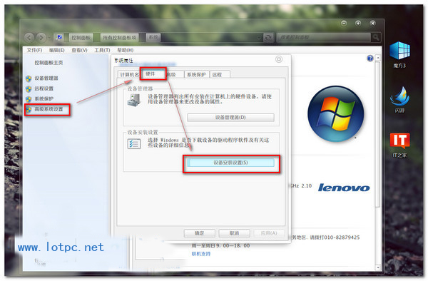 選擇左邊選項卡的【高級系統設置】,切換到【硬件】選項卡,選擇第二個【設備安裝設置】