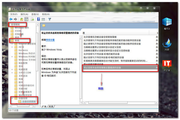 依次展開【計算機配置】-【管理面板】-【系統】-【設備安裝】-【設備安裝限制】。雙擊右側的【禁止安裝未由其他策略設置描述的設備】