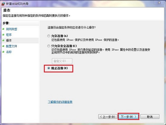 在出現的對話框中,選中“阻止連接”,點擊“下一步”
