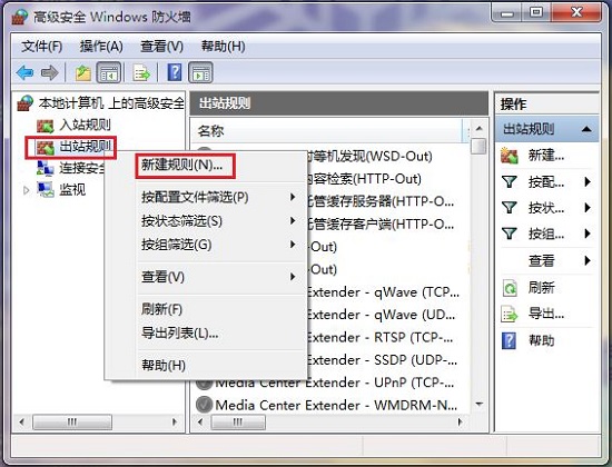 右鍵點擊左邊的“出站規則”,在菜單中選擇“新建規則”。