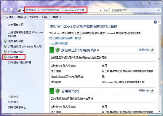 依次點擊開始→控制面板→windows防火墻。左邊,點擊高級設置,得到如下窗口: