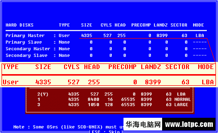 將光標移到這一項,回車,電腦自動檢測硬盤。這是電腦檢測到的硬盤參數。