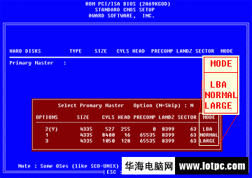 這是電腦檢測到了主硬盤,它可以以三種方式設置:如果你的硬盤是6.4G的話,選NORMAL模式你只能用到528M;選LARGE模式,只能用到2.1GB;而實際使用中我們都選LBA 模式。選“Y”這是電腦的推薦選項。
