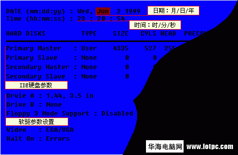 這是硬盤情況,剛才我們檢測到的硬盤參數在這里可以看到,這時只有一個硬盤,4335M,有時我們安裝了多個硬盤時,想去掉一個硬盤,就要在這里操作,將光標移動到這里,然后按Page up,將其選擇為NONE即可。
