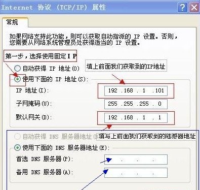 我們進入internet 協議(TCP/IP)屬性界面后,相信大家都知道怎么設置本機ip地址了,點擊單選框“使用下面的IP地址(s)”,在使用以下IP地址下的三項中分別填寫上本機的IP地址、子網掩碼地址以及路由器默認地址(默認網關),ip地址通常為192.168.1.xx (xx是1-254之間任意數字,和其他主機不同即可。