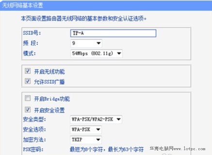 選擇左邊的“網絡參數”,選擇“LAN口設置”,要記錄右邊的IP和MAC地址。再單擊左邊的“無線參數”,選擇“基本設置”,在“SSID號”文本框中輸入“TP-A”,再將信道(也叫頻段)選擇為“9”:為保證網絡和橋接的穩定性,建議勾選“開啟SSID廣播”功能。