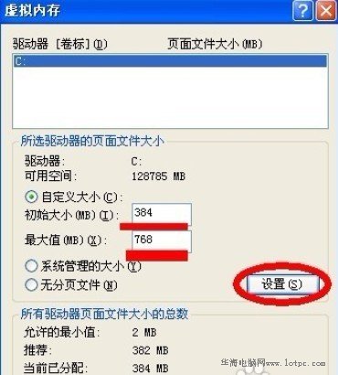 輸入“初始大小”和“最大值”,然后點(diǎn)擊“設(shè)置”按鈕。(虛擬內(nèi)存設(shè)置的原則是:虛擬內(nèi)存最小值是物理內(nèi)存的1到1.5倍;虛擬內(nèi)存最大值是物理內(nèi)存的2到2.5倍。)公式:1G內(nèi)存=1024MB 自己算下。
