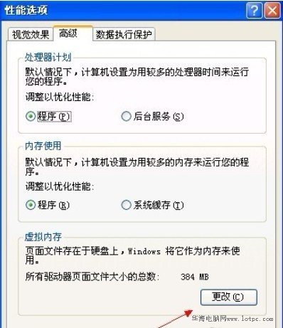 性能選項(xiàng)窗口中單擊“高級(jí)”,點(diǎn)擊虛擬內(nèi)存“更改(C)”按鈕