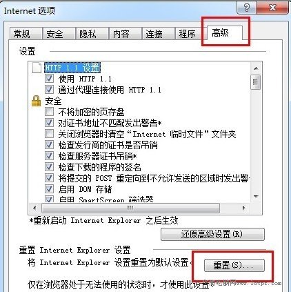 在“internet選項”彈窗框,找到“高級”選項卡,點擊進入后,點擊“重置”,確認后,重啟IE瀏覽器。
