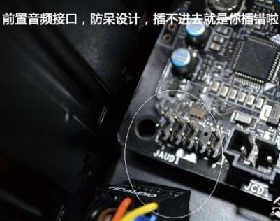 機箱前置音頻跳線連接 ,說白了就是機箱前面的音頻接口連接,如上圖,找到機箱里的標有HD audio的接口插入主板上的JAUD1接口即可。