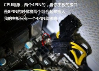 主板供電連接號后,然后是CPU電源,看你的主板,是8PIN的就組合起來插入,像我只有一個4PIN就后了,一般CPU供電均是4PIN,如下圖:將電源中的4PIN接口插入CPU附近的4PIN插槽中