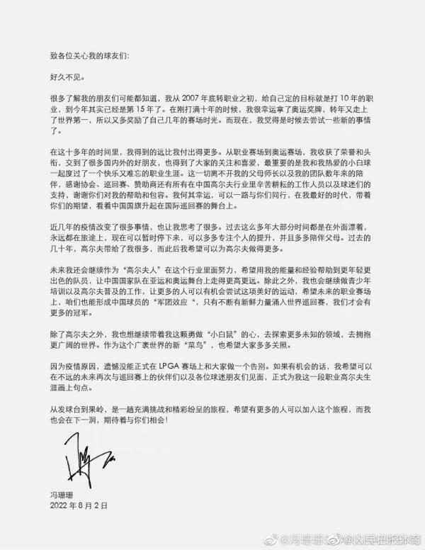高爾夫大滿(mǎn)貫冠軍馮珊珊宣布退役
