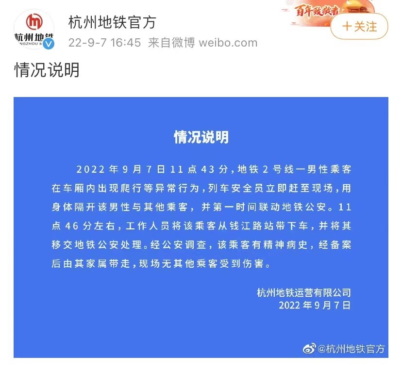 杭州一男子地鐵內(nèi)跪地學(xué)狗叫 回應(yīng):