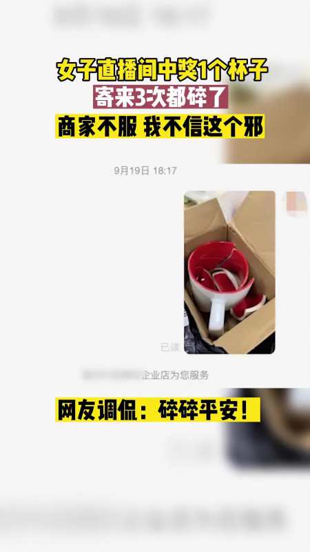 女子中獎(jiǎng)杯子寄3次都碎了 商家不服