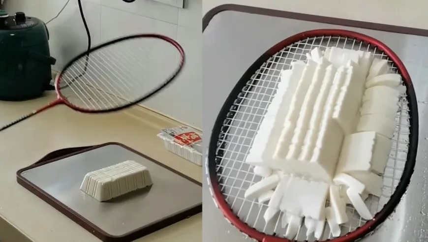 男子用羽毛球拍瞬間切好豆腐:會燒菜