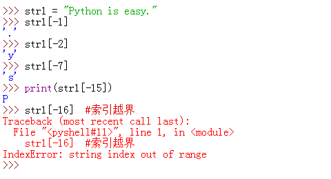 >>> str1 = "Python is easy." >>> str1[-1] '.' >>> str1[-2] 'y' >>> str1[-7] 's' >>> print(str1[-15]) P >>> str1[-16] #索引越界 Traceback (most recent call last): File "<pyshell#11>", line 1, in <module> str1[-16] #索引越界 IndexError: string index out of range >>>