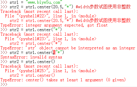 另外,在使用center()函數時,width參數是必須的,且只能為整數,下面圖中所示的幾種使用方法都是錯誤的。