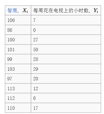 例2:檢驗智商和其每周花在 電視上的小時數的相關性,其數據如下: