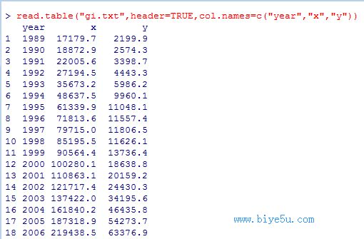 (3)read.table("gi.txt",header=TRUE,col.names=c("year","x","y")) #指定列名的情形