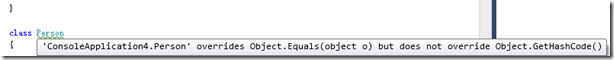 就是這么簡單。OK。原以為大功告成了,可是看看我的代碼卻發現了我的Person下出現了讓我頭疼的波浪線。提示的意思是說,我重載了Equals方法,但是卻沒有重載GetHashCode方法。
