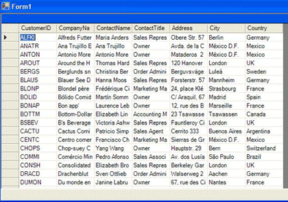 然后,我定義數據組ds,它被用來從網格控件中的用戶表(Customers)中獲得實際數據。我使數據網格控件dataGrid1的DataMember特性指向到我獲得數據的表格,并將控件DataSource的特性設定給DataSetds。(DataMember特性獲得/設定DataSource中的一個綁定控件的表格,DataSource特性獲得/設定用來安裝控件的數據源。)當你運行列表A中的代碼時,結果如圖2所示。