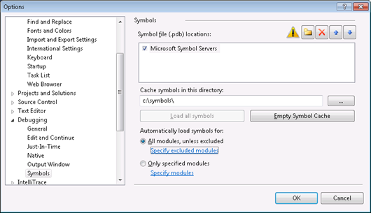 選擇All modules,unless excluded,你可以下載到symbol服務器上所有更新的文件。
