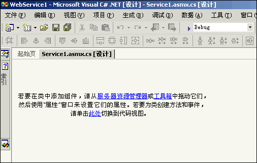 因?yàn)槲覀円獙?shí)現(xiàn)的是一個(gè)非常簡(jiǎn)單的Web服務(wù),所以我們需要的功能和我們的代碼量都很小,于是就不必去考慮上圖中的“服務(wù)器資源管理器”和“工具箱”兩個(gè)超鏈接,而可以直接點(diǎn)擊上圖中的“此處”鏈接進(jìn)行代碼編輯,點(diǎn)擊后會(huì)打開(kāi)代碼編輯框,圖示如下:
