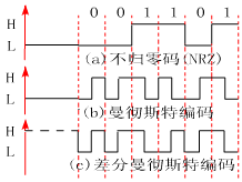 兩種曼徹斯特編碼是將時鐘和數據包含在數據流中,在傳輸代碼信息的同時,也將時鐘同步信號一起傳輸到對方,每位編碼中有一跳變,不存在直流分量,因此具有自同步能力和良好的抗干擾性能。但每一個碼元都被調成兩個電平,所以數據傳輸速率只有調制速率的1/2。