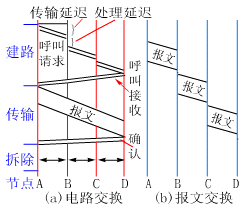 2)在交換節(jié)點(diǎn)中需要緩沖存儲(chǔ),報(bào)文需要排隊(duì),故報(bào)文交換不能滿足實(shí)時(shí)通信的要求。