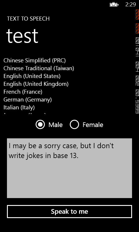 <phone:PhoneApplicationPage x:Class="TextToSpeechDemo.MainPage" xmlns="http://schemas.microsoft.com/winfx/2006/xaml/presentation" xmlns:x="http://schemas.microsoft.com/winfx/2006/xaml" xmlns:phone="clr-namespace:Microsoft.Phone.Controls;assembly=Microsoft.Phone" xmlns:shell="clr-namespace:Microsoft.Phone.Shell;assembly=Microsoft.Phone" xmlns:d="http://schemas.microsoft.com/expression/blend/2008" xmlns:mc="http://schemas.openxmlformats.org/markup-compatibility/2006" mc:Ignorable="d" FontFamily="{StaticResource PhoneFontFamilyNormal}" FontSize="{StaticResource PhoneFontSizeNormal}" Foreground="{StaticResource PhoneForegroundBrush}" SupportedOrientations="Portrait" Orientation="Portrait" shell:SystemTray.IsVisible="True"> <!--LayoutRoot is the root grid where all page content is placed--> <Grid x:Name="LayoutRoot" Background="Transparent"> <Grid.RowDefinitions> <RowDefinition Height="Auto"/> <RowDefinition Height="*"/> </Grid.RowDefinitions> <!--TitlePanel contains the name of the application and page title--> <StackPanel x:Name="TitlePanel" Grid.Row="0" Margin="12,17,0,28"> <TextBlock Text="{Binding Path=LocalizedResources.ApplicationTitle, Source={StaticResource LocalizedStrings}}" Style="{StaticResource PhoneTextNormalStyle}"/> <TextBlock Text="{Binding Path=LocalizedResources.PageTitle, Source={StaticResource LocalizedStrings}}" Margin="9,-7,0,0" Style="{StaticResource PhoneTextTitle1Style}"/> </StackPanel> <!--ContentPanel - place additional content here--> <Grid x:Name="ContentPanel" Grid.Row="1" Margin="12,0,12,0"> <StackPanel> <ScrollViewer Height="200"> <ComboBox HorizontalAlignment="Left" Width="456" Name="voicesComboBox" DisplayMemberPath="Name" /> </ScrollViewer> <StackPanel Orientation="Horizontal" HorizontalAlignment="Center"> <RadioButton Content="Male" IsChecked="true" Name="MaleRadioButton"/> <RadioButton Content="Female"/> </StackPanel> <TextBox HorizontalAlignment="Left" Height="230" TextWrapping="Wrap" Width="456" Text="I may be a sorry case, but I don't write jokes in base 13." Name="inputTextBox"/> <Button Content="Speak to me" HorizontalAlignment="Left" Width="456" Click="SpeakToMe_Click"/> </StackPanel> </Grid> </Grid></phone:PhoneApplicationPage>