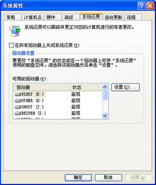 使用該功能前,先確認Windows XP是否開啟了該功能。鼠標右擊“我的電腦”,選擇“屬性”/“系統還原”選項卡,確保“在所有驅動器上關閉系統還原”復選框未選中,再確保“需要還原的分區”處于“監視”狀態。