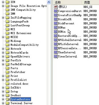 默認情況下Windows XP的用于“系統還原”的空間最大為12%,但可以通過修改注冊表來更該這個值。運行注冊表編輯器,后依次展開HKEY_LOCAL_MACHINE/SOFTWARE/Microsoft/WindowsNT/CurrentVersion/SystemRestore分支,在右側窗口中可以看見兩個DWORD值“DSMax”和“DSMin”(圖10),分別代表系統還原的最大和最小磁盤空間,直接修改它們的鍵值即可。該分支下還有一個名為“DiskPercent”的DWORD值,它表示要為系統還原分配的磁盤空間百分比,默認值為12%,我們可以根據需要對其適當調整。