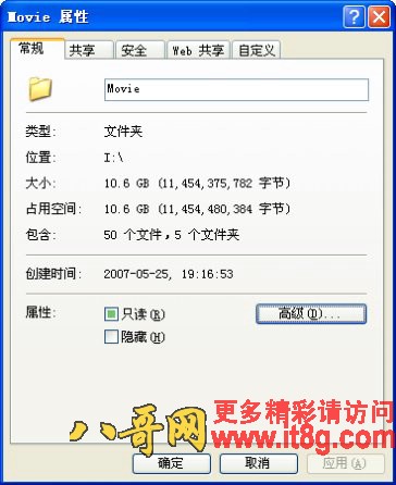 如果你不想更新系統補丁或者是因為其他情況不能更新補丁的話,可以打開“我的電腦”窗口,找到保存事頻文件的文件,右擊單擊該文件夾,在彈出的快捷菜單中選擇“屬性”,在打開的“屬性對話框中,在“常規”標簽下,單擊“高級”按鈕(見圖3),在打開的“高級屬性”對話框中,去除“為了快速搜索,允許索引服務編制該文件夾的索引”選項的選擇(見圖4)。