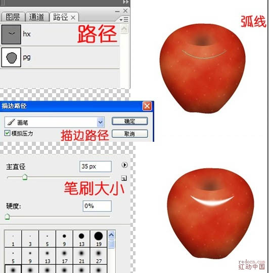 9、蘋果高亮的地方,新建圖層,設置畫筆大小,筆刷大小35,硬度0,點開路徑面板,新建路徑層,鋼筆工具勾出一條弧度的線,路徑描邊--畫筆,勾上模擬壓力。
