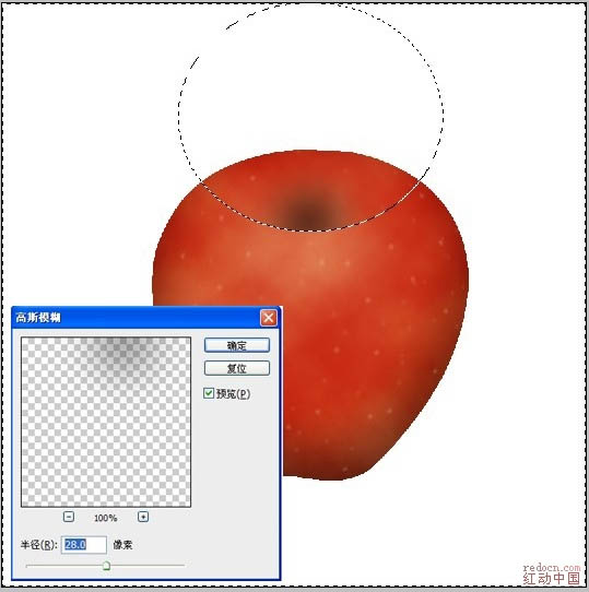 8、選擇濾鏡—模糊—高撕模糊,半徑設置為:28, 選擇橢圓選框工具,適當?shù)睦鲆粋€橢圓的大小,CTRL+SHIFT+I進行反選,刪除。