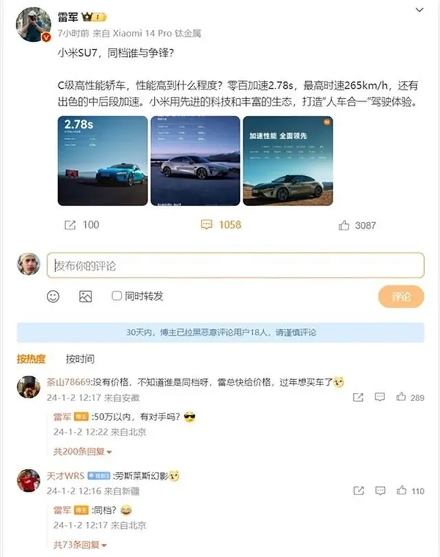 雷軍稱(chēng)小米SU7五十萬(wàn)內(nèi)沒(méi)有對(duì)手:小