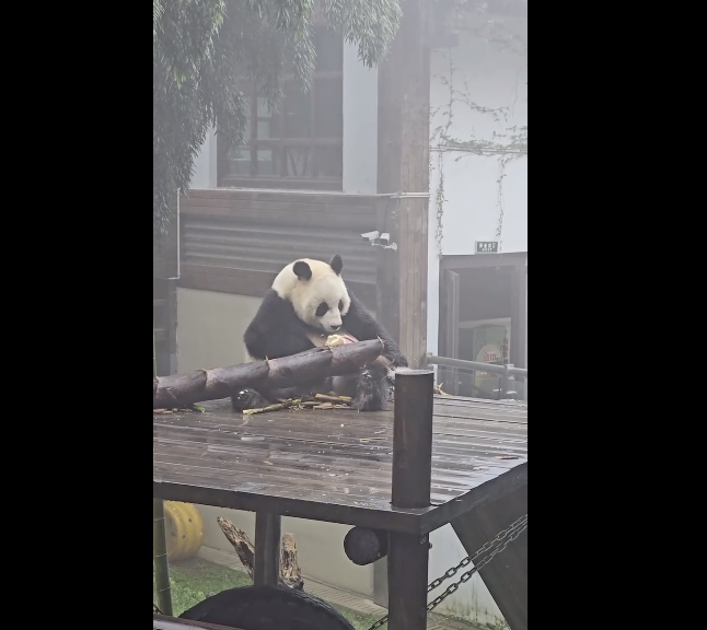 大熊貓吃筍整出了扛炮筒的架勢 熊