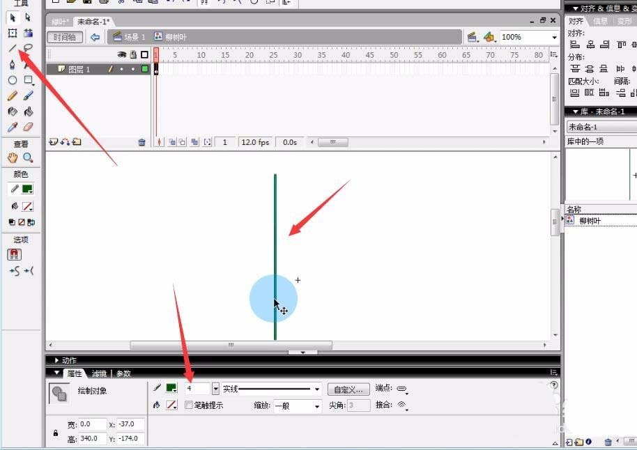 2、接下來筆觸顏色選擇深綠色。自己選擇線條工具,在舞臺上繪制一條直線。打開屬性面板,將屬性面板的,筆觸粗細(xì)調(diào)節(jié)為4。然后再點(diǎn)擊選擇工具將線條,拖彎一些。